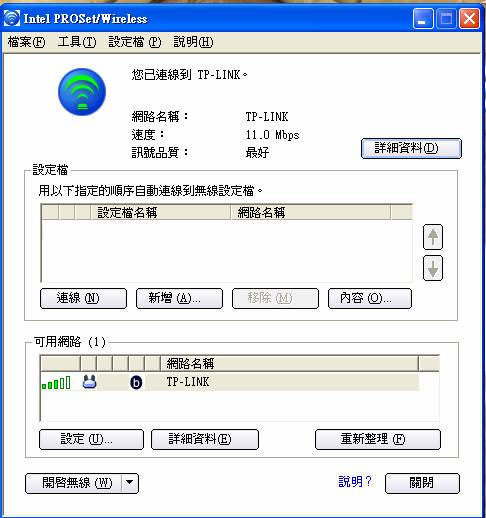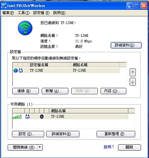 華碩A3000筆記本的無線開關為Fn+F2(有部分筆記本無線開關為按鍵,打開后指示燈亮),打開無線功能,無線網卡會自動搜索鄰近的無線AP,找到后會在任務欄中有一個無線信號指示圖標,表示無線AP信號強弱(好像手機信號)如圖 圖4 雙擊上圖的信號圖標,如下圖,內容是找到的無線AP的詳細說明,名稱為“TP-LINK”,看完了點擊“關閉”。 圖5 下一步,開始---設置---網絡連接,打開網絡連接,如圖 圖6 無線網卡顯示已連接(如果打個紅色的X,則沒有打開無線網卡,按鍵盤上的Fn+F2打開無線網卡或右擊連接,或者右擊---選“啟用”OK)。雙擊無線絡路連接,打開無線網絡設定,如圖: