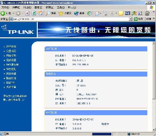 下來就是怎么樣將筆記本接局域網,無線上網一定是要買個AP了,(AP功能看說明書) 偶選擇了TP-LINK公司TL-WR245無線寬帶路由器。TL-WR245無線寬帶路由器集防火墻、路由器、無線功能技術于一身,是小型辦公室和家庭的無線上網需要而設計,,室外傳輸距離300M,室內傳輸距離30~130M,TL-WR245的路由功能是用不上了,就不討論了。