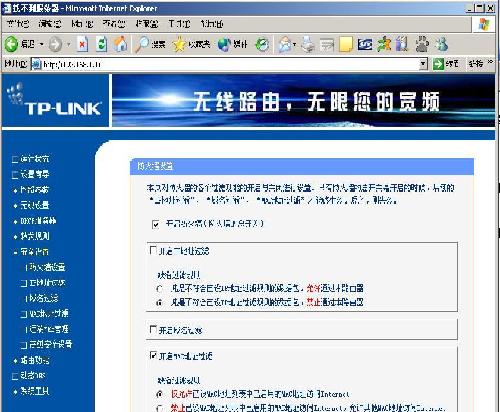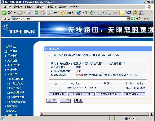 連接建立好了,以上TL-WR245全是默認設置,任何有無線網卡的電腦都可以連接加入,網絡不安全,還要進行安全設定。TL-WR245的IP為192.168.1.1,子網掩碼是255.255.255.0,要進入TL-WR245的WEB管理界面,先要設定電腦的IP與TL-WR245的IP為同一網段,我將局域網鄰近的一臺電腦改IP為192.168.1.2,打開IE,地址欄中輸入192.168.1.1,要求輸入用戶名和密碼,默認用戶名和密碼是Admin,打開TL-WR245WEB管理界面,如圖 圖11 TL-WR245 無線AP有兩種過濾方式:“MAC地址過濾”和“IP地址地濾”,因公司筆記本不 多,所以我選擇了MAC地址過濾。點左邊的安全設置----設置防火墻,選中“開啟防火墻”,“開啟MAC地址過濾”。設置好后,點擊“保存”,不然就白做了,記注以后的所有設置都要保存。 圖12 下來點左力的安全設置----MAC地址過濾,添加需要無線接入電腦的MAC地址即可,完成后保存,如圖 圖13 再修改無線路由器的密碼(密碼設置復雜一點),相信很少有人可以入侵了,就是有人想入侵,AP放在公司內,傳送距離也有限,我也不用擔心大批的黑客了。
