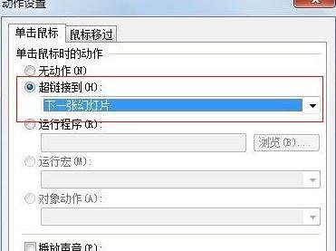 鼠標右擊矩形,選擇動作設置,勾選超鏈接到,選擇下一張幻燈片。