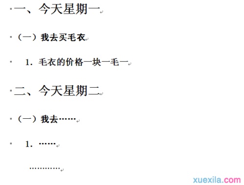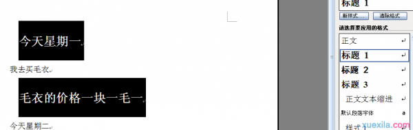 對于這樣的序列號,我們有兩種設置方法:第一種是從格式項目符號和編號多級序列號中選擇所需的模板或定制。這種操作很簡單,但有時難以控制,也不容易理解;另一個是我們直接給樣式分配不同的樣式號。雖然這更麻煩,但更容易控制,而且自己動手意味著更多。 好,讓我們練習一下。 讓我們說,“今天星期一,我要去買一件毛衣。這件毛衣的價格是11美分一件。今天,星期二,我要去買…,例如,讓我們練習如何制作3級標簽。 一,多層次數字的使用 多級編號的使用本質上與格式設置相同,所以我們應該采用先編輯后設置的方法。 第一步:輸入我們需要達到以下效果的文本 今天,星期一。 我會買一件毛衣。 這件毛衣的價格是11美分一件。 今天,星期二。 我要去買. …… 全部為文本和默認格式 然后我們可以設置多級序列號 好,讓我們以這個為例來解釋如何設置多級數字的格式和內容。 1.首先,選擇所有的字符并設置標題樣式:在這里,我們使用“今天星期一”和“今天星期二”作為標題一,“我要買毛衣”和“我要買……”作為標題二,“和”作為標題三。打開格式中的樣式和格式,并選擇相應的樣式,如下圖1和圖2所示