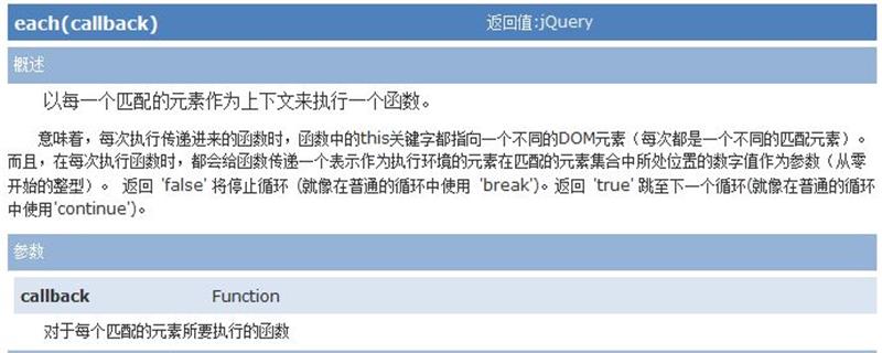 jQuery中的each()函數用于循環數據,類似于for each循環。所以我們可以使用它來循環來自相同選擇器的多個DOM對象 each() 方法 為每個匹配元素規定要運行的函數。 $(selector).each(function(index,element)) function(index,element) :為每個匹配元素規定所運行的函數。 index : 選擇器的 index 位置,獲取索引值 element :當前的元素(也可使用 "this" 選擇器) 當在each函數內部時,我們可以通過使用this關鍵字來訪問當前元素,但是這個對象不是jQuery對象 $("a").each(function(){