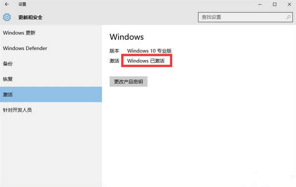 激活密鑰截圖(6) 8、這時候,我們作最后的確認,打開控制面板中“設置”界面,點擊“更新和安全”按鈕進入,找到“激活”選項卡,就可以看到當前Win10專業版已激活。